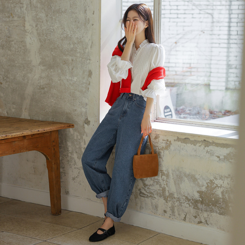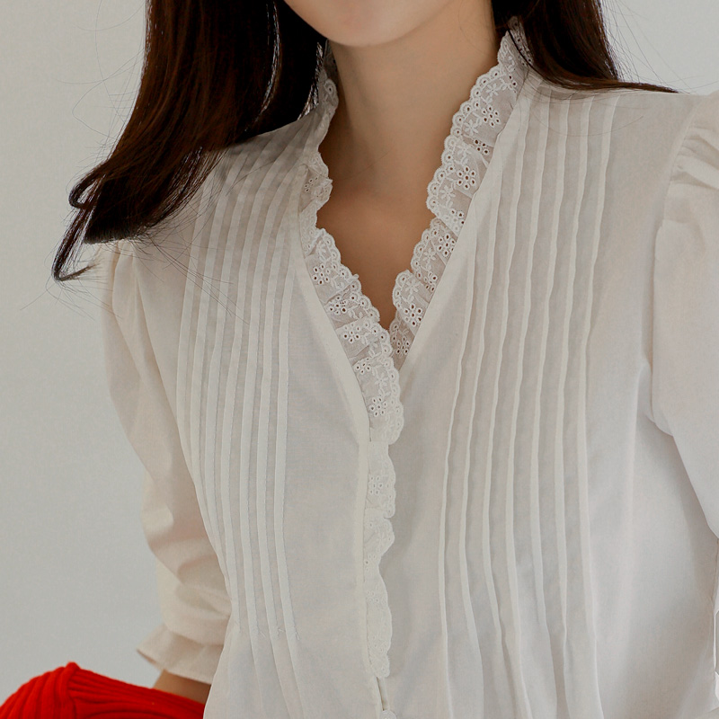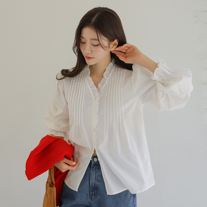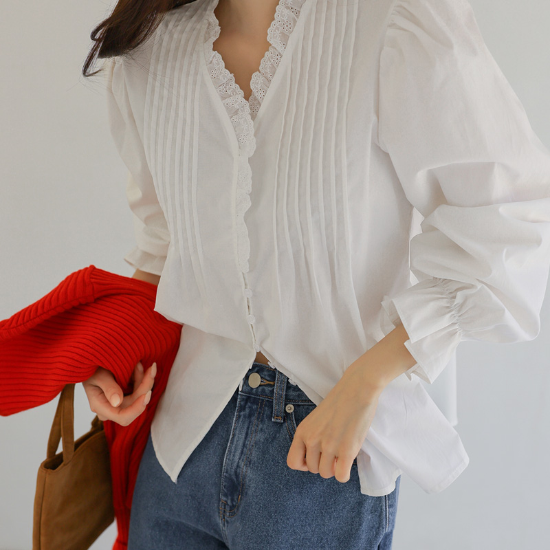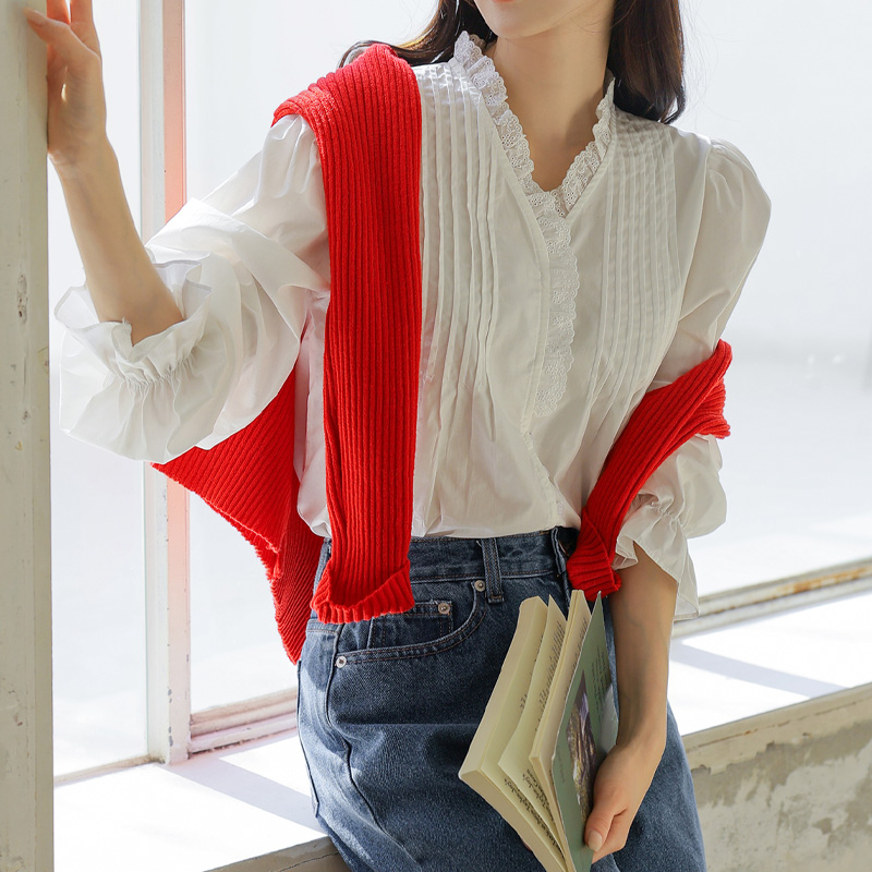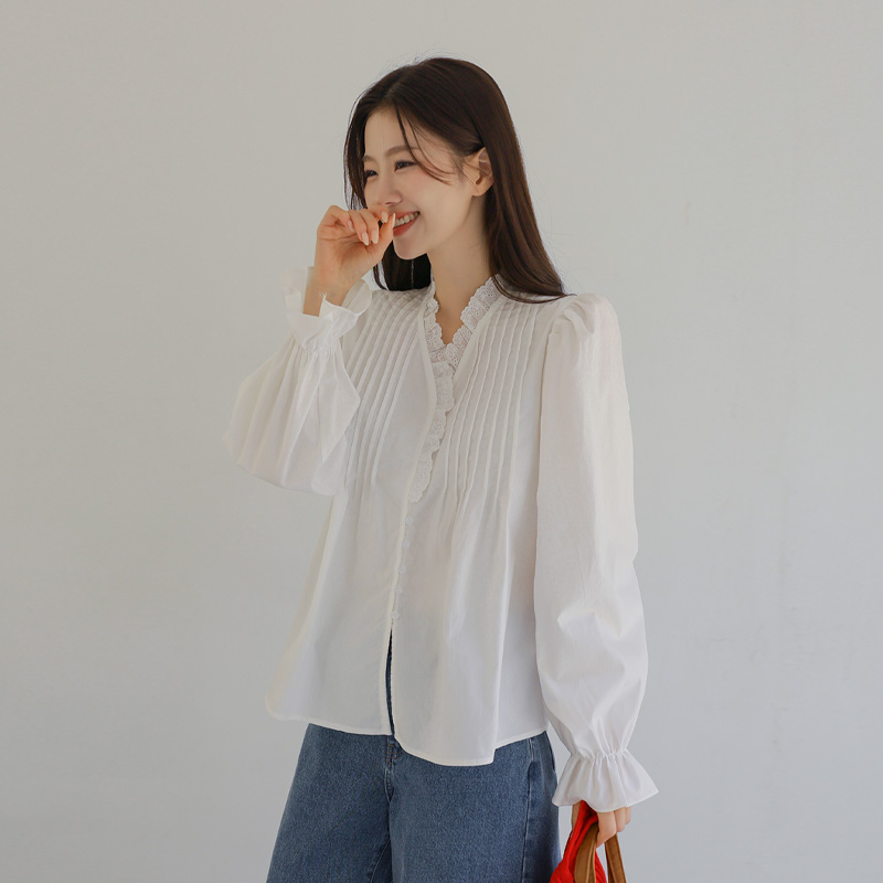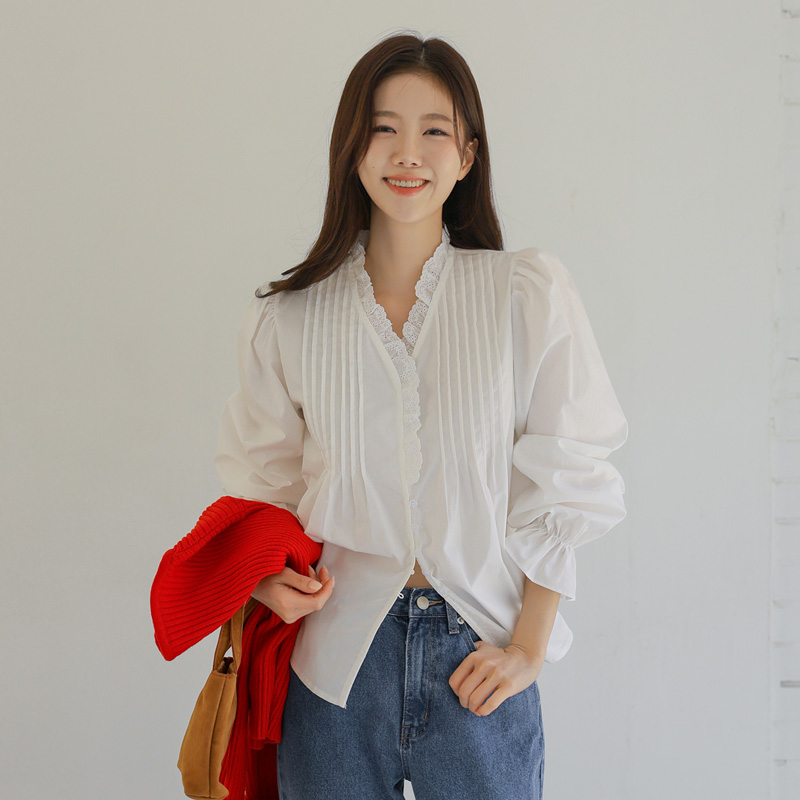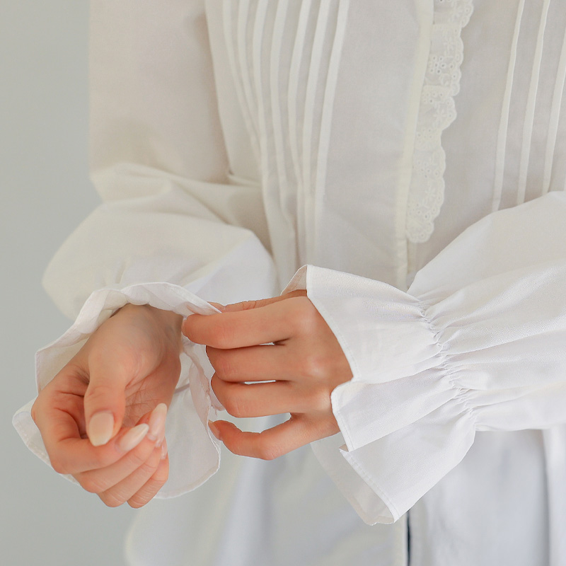 어깨 핀턱 퍼프 디자인과 러플 소매