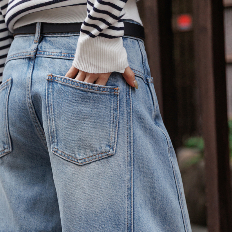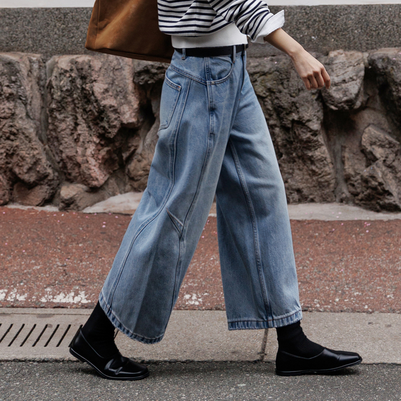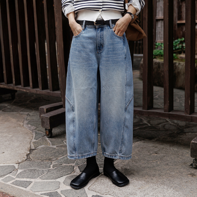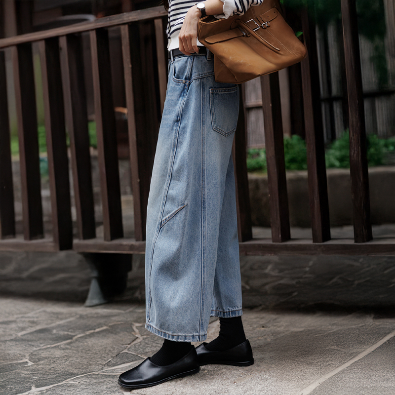 실루엣이 돋보이는 9부 커브드 데님 팬츠입니다.