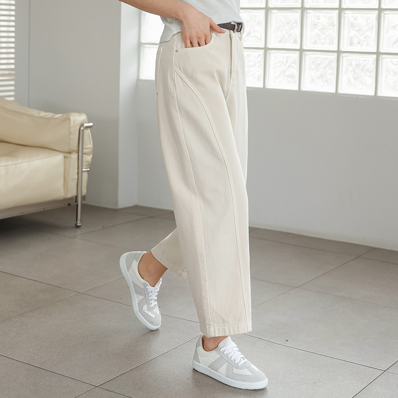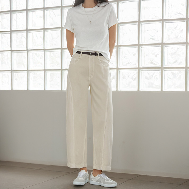"감각적인 곡선 실루엣이 돋보이는 커브드 9부 팬츠입니다.